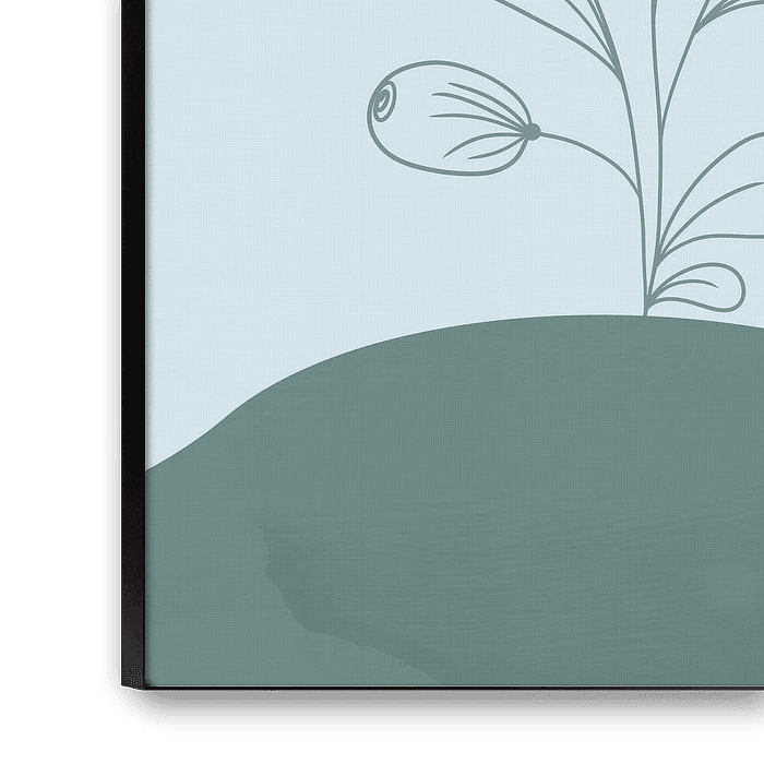 Paysage minimaliste aux couleurs d'un lever de soleil d'hiver : nuances opaques de bleu et d'orange. Une plante est représentée poussant entre des collines avec une forme de soleil en arrière-plan.