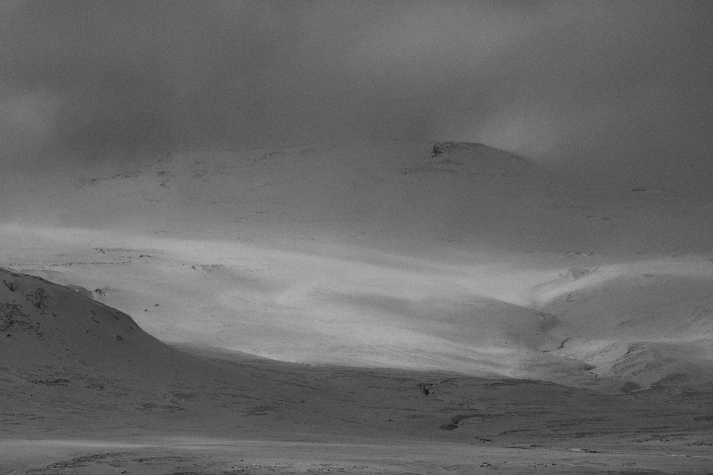 Un beau paysage minimaliste et abstrait en noir et blanc de l'Islande. Une tempête hivernale et des rayons de soleil se disputent un endroit au-dessus des montagnes.