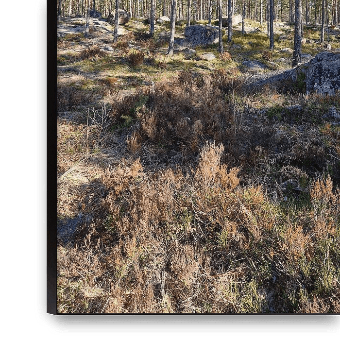 Paysage suédois avec un ciel bleu et des pins et des rochers typiques du Smalland et une végétation sèche qui sera de nouveau fraîche et verte en été avec des baies c'est un ensemble en pente c'est en Smalland lingon des baies. dos de la colline
