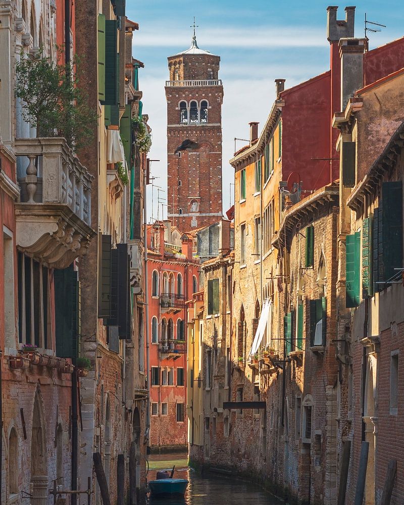 Paysage urbain de Venise, canal étroit, clocher en arrière-plan et bâtiments traditionnels. Italie, Europe.