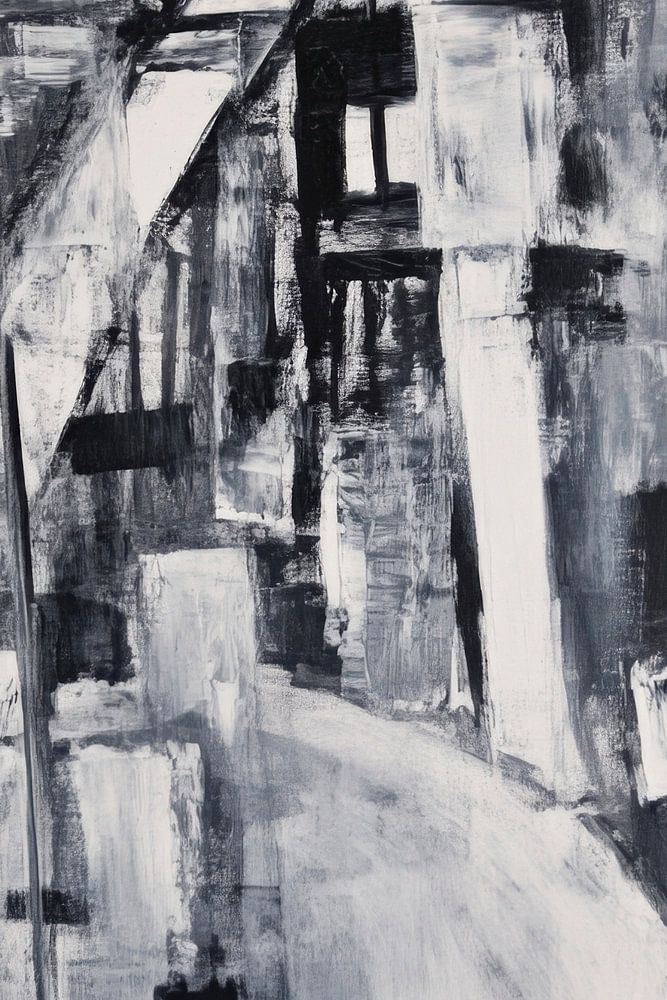 Dans un jeu d'ombre et de lumière, une ruelle mystérieuse se déploie, traversée par des noirs et des blancs contrastés. Des formes géométriques forment un paysage presque surréaliste, tandis que des chemins étroits et des fenêtres fragmentées plongent le spectateur dans une ambiance mélancolique. L'expression de froideur et d'abandon attire immédiatement l'attention.