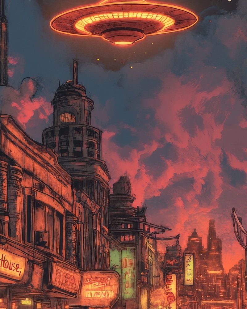 L'image représente un paysage urbain animé, baigné par la lueur chaude d'un soleil couchant. De grands bâtiments futuristes bordent les rues, ornés d'enseignes au néon et de fenêtres lumineuses. Dans le ciel, plusieurs soucoupes volantes planent au-dessus de la ville, créant un sentiment d'émerveillement et d'anticipation. La scène est remplie de gens qui vaquent à leurs occupations quotidiennes, marchant sur les trottoirs et conduisant des voitures anciennes.