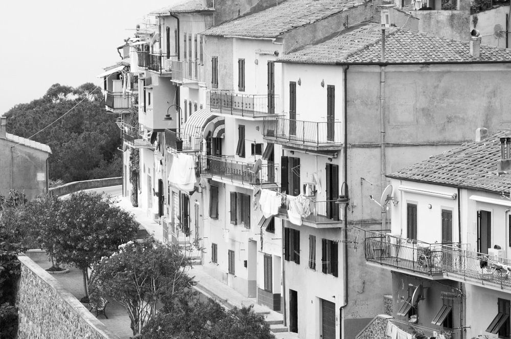 Vue de la zone résidentielle sur les pentes de Capoliveri sur l'île d'Elbe en Italie. Les rues et les bâtiments en gradins offrent une vue magnifique.