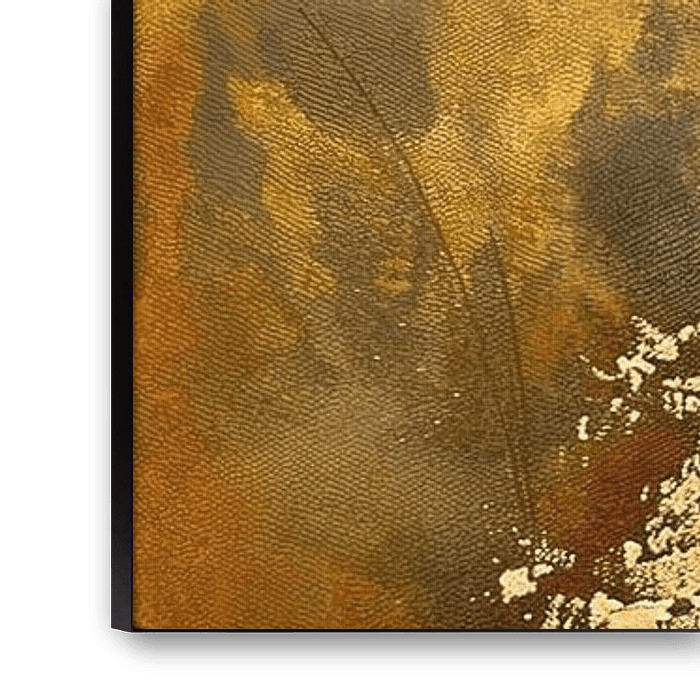 Peinture abstraite | Whispered Energy - Cette peinture abstraite joue avec une composition captivante de zones de couleurs et de textures. La moitié supérieure est recouverte d'une couche de gris pâle, tapissée de coups de pinceau tactiles qui suggèrent une atmosphère de brume ou de cendre. Sous cette couche se trouve une partie ocre vif qui rayonne de chaleur et d'énergie. Dans cette partie, des éclaboussures blanches abruptes et dynamiques sont combinées à de délicates lignes noires, qui rappellent des fleurs ou des explosions, créant un contraste avec le calme qui règne au-dessus. Cette partie du tableau est enrichie d'ombres sombres et de formes abstraites qui ajoutent de la profondeur et du mystère. En résumé, la peinture abstraite utilise la texture et une palette de couleurs limitée pour créer un dialogue visuellement impressionnant entre la tranquillité et le dynamisme.