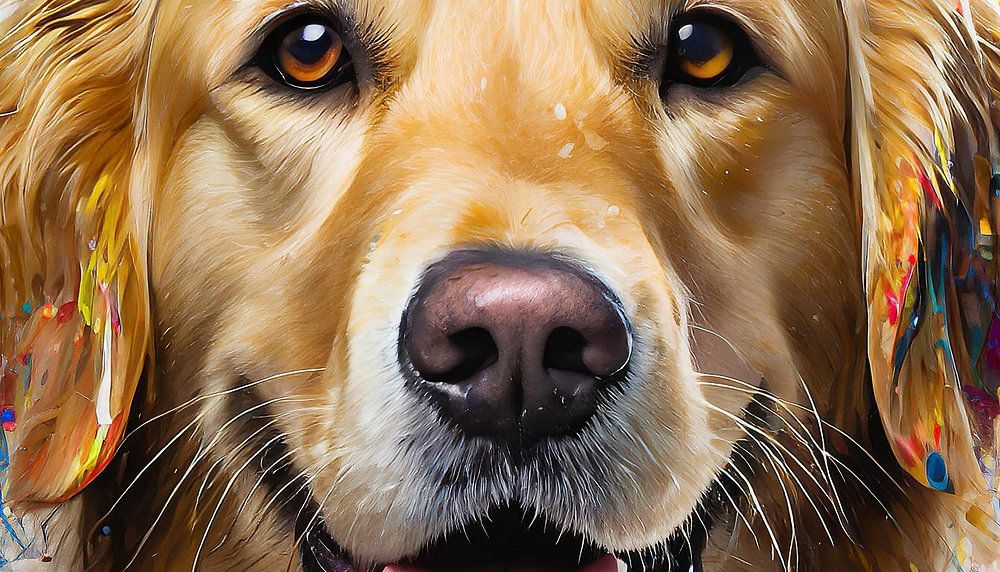 A propos de "Peinture d'un visage de chien Golden Retriever avec des éclaboussures de peinture colorée"
