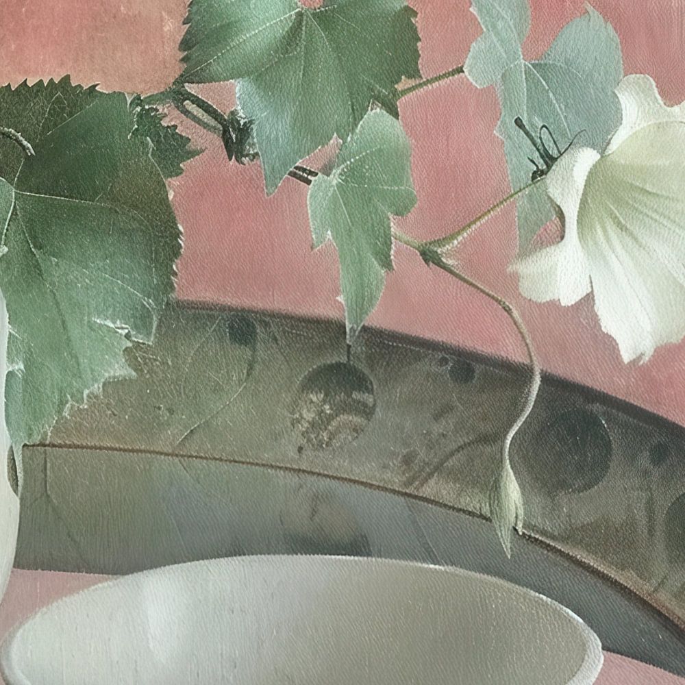 Peinture de fleurs | Still Serenity - Cette peinture de nature morte présente une composition élégante d'une fleur blanche épanouie avec des feuilles vertes sur un plateau brun rouille, à côté de deux bols blancs simples sur un fond rose.