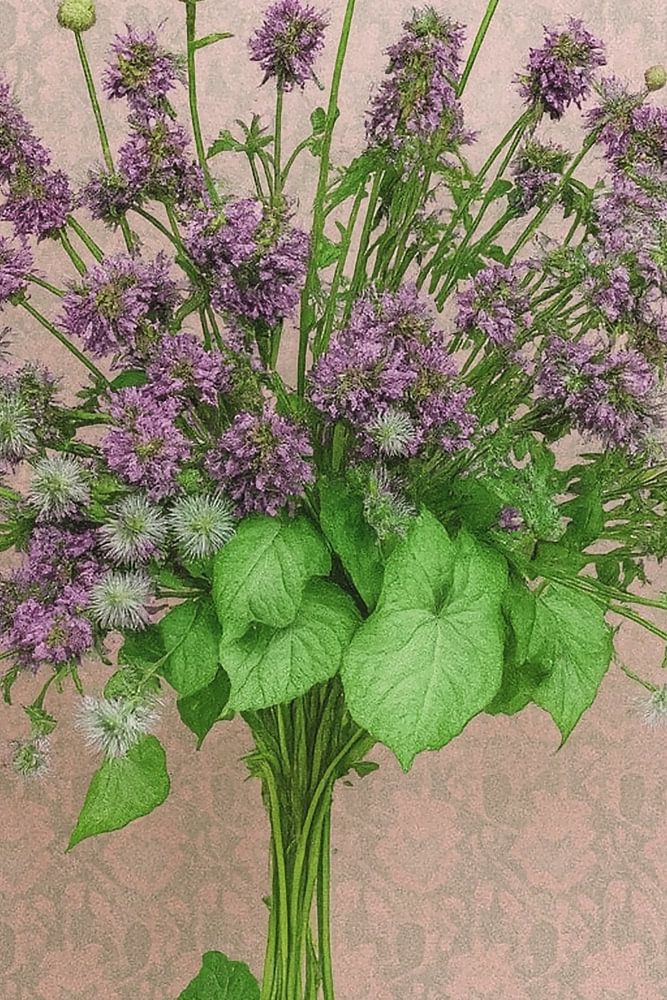 Bouquet élégant de fleurs violettes et de feuilles vertes fraîches sur un fond rose à motifs délicats, pour attirer l'attention.
