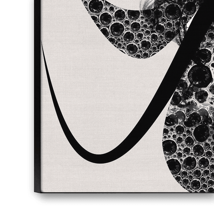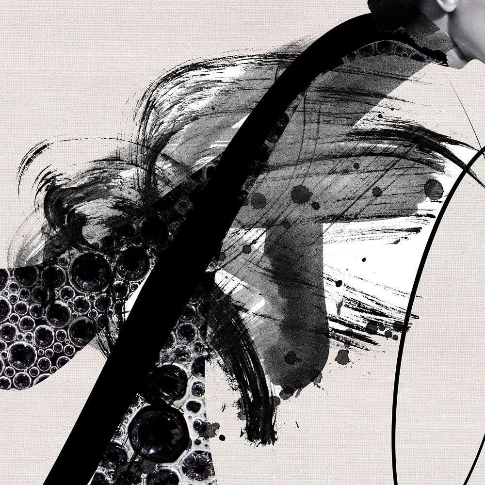 Représentation artistique stylisée d'une femme de profil, partiellement recouverte de traits d'encre noire abstraits et d'éléments graphiques fluides. Les éléments graphiques oscillent et s'interpénètrent, créant ainsi un mouvement dynamique autour de la personne représentée. L'arrière-plan est une texture plate de couleur crème. La palette de couleurs se limite au noir et au blanc, ce qui renforce le contraste et l'effet artistique.