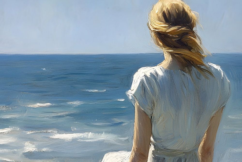 La femme semble perdue dans l'immensité de la mer, comme si elle cherchait quelque chose ou se perdait dans ses pensées. En même temps, un certain calme et une certaine clarté résonnent - une pause entre la nostalgie, le souvenir et le désir d'éloignement.
