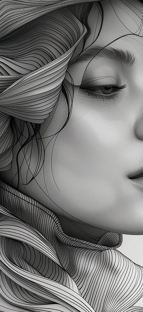 La femme dégage une introspection calme, les traits délicats de son visage s'entremêlant harmonieusement avec les lignes détaillées décrivant le tissu de son chapeau et les vagues de ses cheveux. Les lignes subtiles et les ombres donnent de la profondeur à l'image, lui conférant une douce élégance et un charme intemporel.
