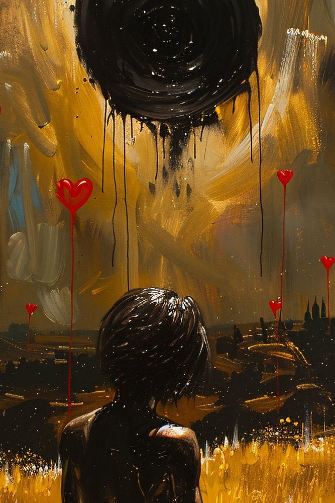 Cette œuvre d'art enchanteresse vous emmène dans un monde où la réalité s'estompe et où les rêves prennent vie. Une figure solitaire entourée de cœurs flottants contemple un vaste paysage. Le ciel sombre et les nuages qui se profilent forment un contraste saisissant avec les teintes chaudes et dorées du champ. Laissez libre cours à votre imagination et découvrez les histoires cachées dans ce chef-d'œuvre. Un must pour tout amateur d'art à la recherche de quelque chose d'unique et d'intrigant.