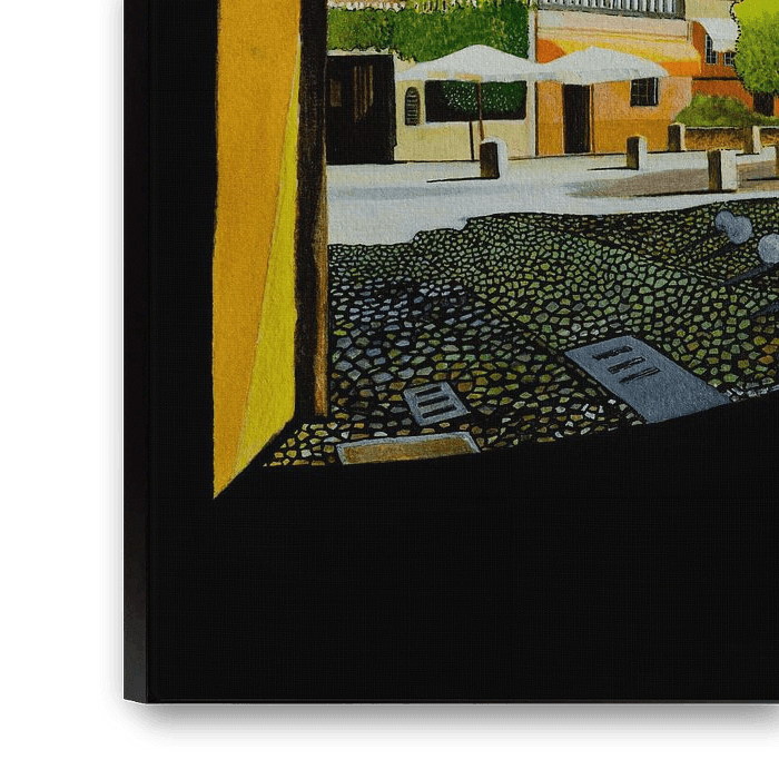 C'est une peinture de Piazzale Cesare Betteloni dans le beau village de Peschiera del Garda sur le lac de Garde en Italie. Si vous marchez de la passerelle piétonne à travers la grande porte de Porta Brescia, vous arriverez à cette petite place amusante et colorée.