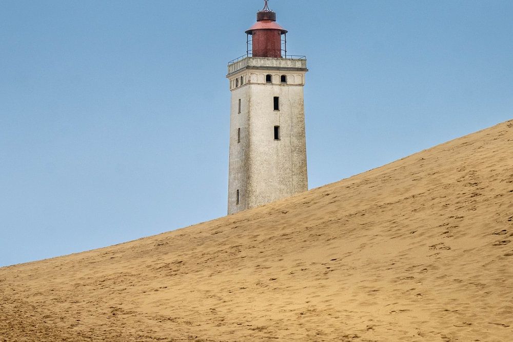 Ce phare carré situé dans les dunes au large de la côte danoise (Jutland) a été spectaculairement déplacé de 70 mètres il y a quelques années, car sinon il aurait disparu dans la mer.