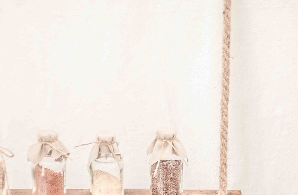 Photo d'une planche ou d'une balançoire en bois contenant des bouteilles de graines, haricots, pois et autres légumineuses avec un joli sceau pour la décoration. La planche est suspendue à un long bâton sur lequel est également accroché un bouquet de lavande séchée. Le tout dans de jolies couleurs pastel naturelles.