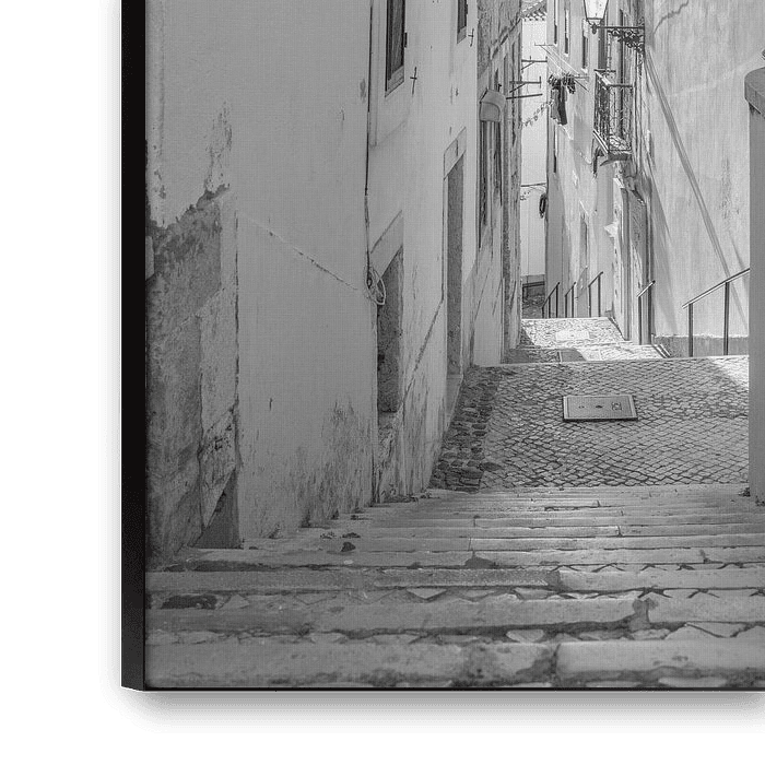 Une photo en noir et blanc d'une ruelle ensoleillée dans le vieil Alfama. Un quartier sur 7 collines, donc où que vous regardiez, vous voyez des escaliers.