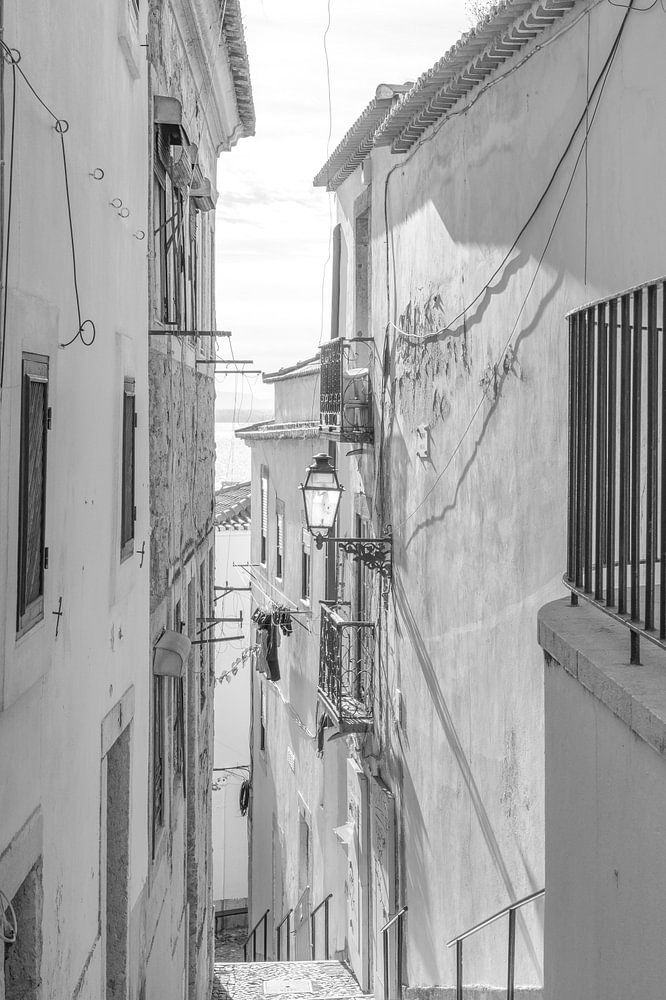 Une photo en noir et blanc d'une ruelle ensoleillée dans le vieil Alfama. Un quartier sur 7 collines, donc où que vous regardiez, vous voyez des escaliers.