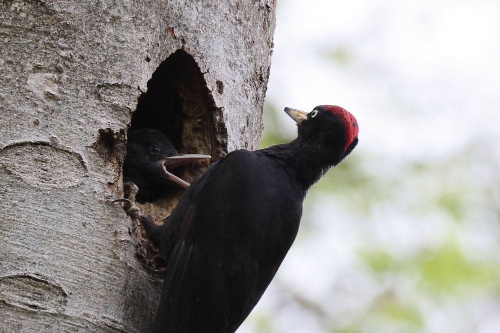 A propos de "Pic noir ( Dryocopus martius ) nourrissant un jeune nid, Album de Swabian Allemagne"