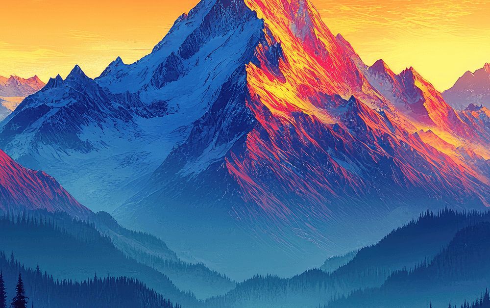 Une illustration étonnante de montagnes enneigées illuminées par les teintes chaudes d'un lever de soleil vibrant. Les couches de forêts bleues brumeuses ajoutent de la profondeur, tandis que le ciel orange ardent rehausse la beauté époustouflante de la grandeur de la nature. Parfait pour les amateurs de paysages sereins et d'art atmosphérique.