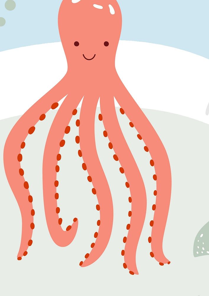 Il nage dans l'océan avec d'autres créatures marines telles que des crabes, une méduse et un hippocampe. Parfait pour une chambre de bébé ou une chambre d'enfant. Forme un triptyque avec les autres illustrations.