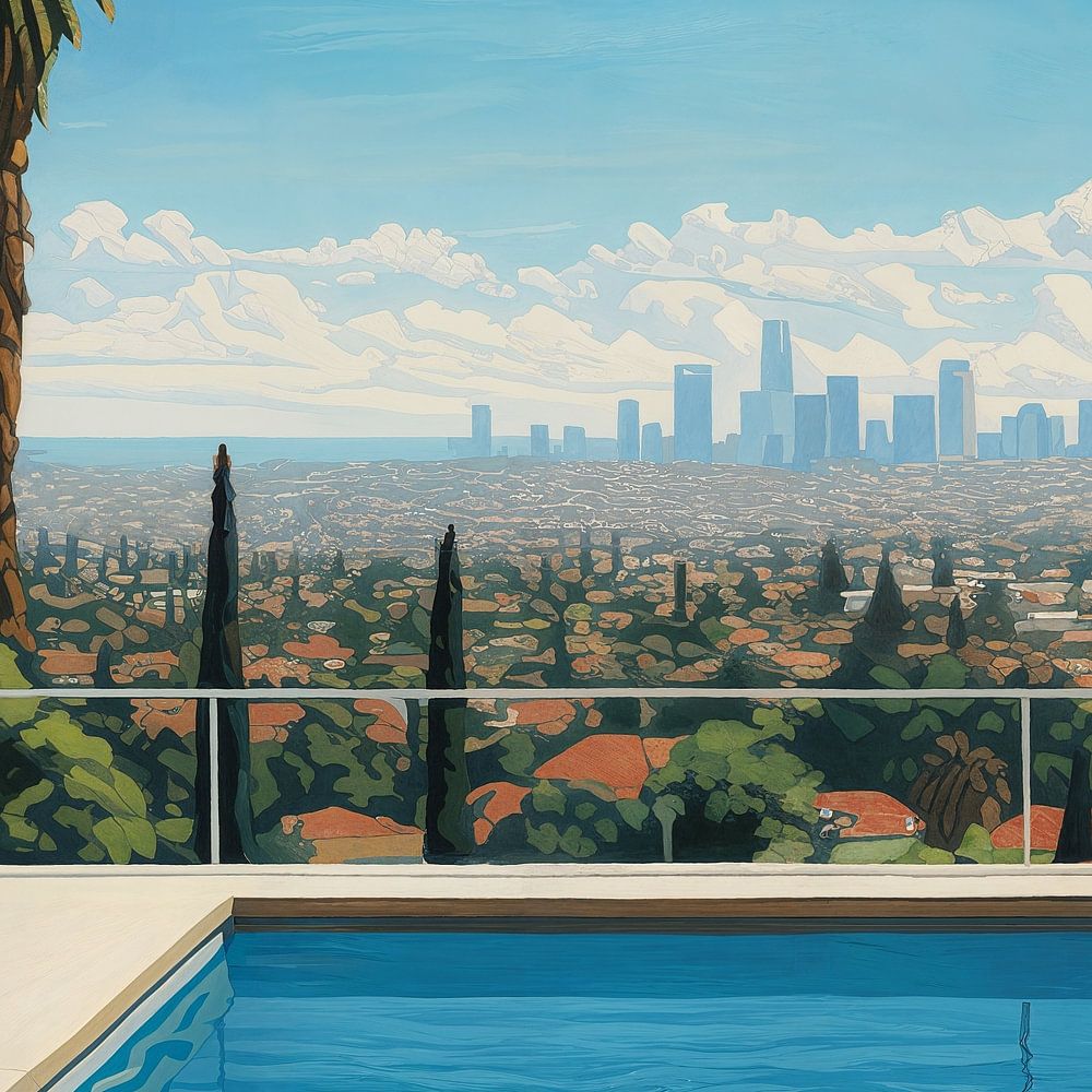 Une œuvre d'art numérique de la vue au-dessus d'une piscine sur Berverly Hills et la ligne d'horizon de Los Angeles, qui ressemble à un tableau.