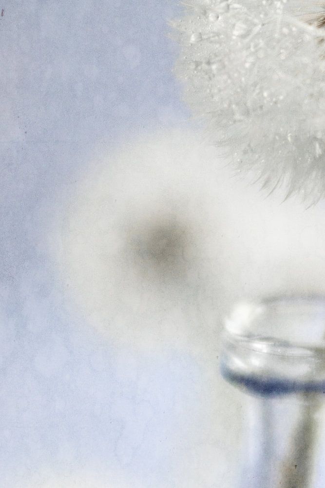 Le robuste pissenlit jaune devient beaucoup plus beau lorsqu'il a fini de fleurir ; il se transforme en une délicate pelote de duvet aux allures de fée. Si vous le touchez par inadvertance, il se désagrège. Si vous voulez le mettre dans un vase, vous devez donc faire très attention. Vous ne pourrez pas profiter longtemps de la peluche, mais vous pourrez la prendre en photo. Cette photo de rêve montre un vase en verre bleu doux avec un pissenlit fraîchement cueilli, encore couvert de rosée. La peluche et la rosée sont très nettes, mais le reste de la photo a été rendu flou pour que le pissenlit blanc se détache joliment du fond bleu. Cette photo sera du plus bel effet dans un intérieur clair.