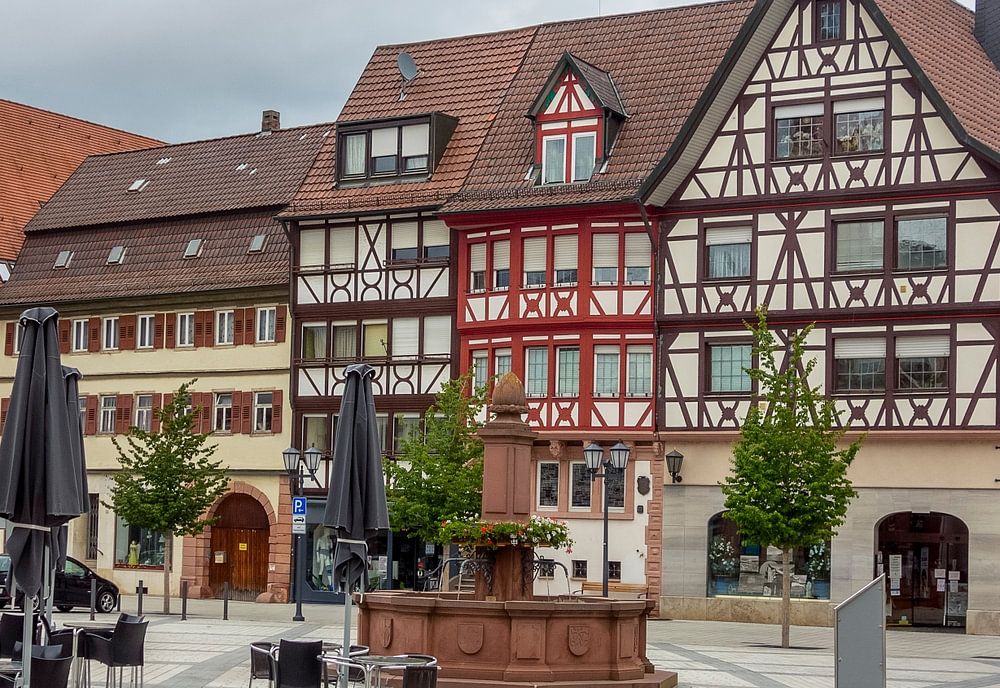 Place du marché avec maisons à colombages à Tauberbischofsheim, une petite ville du sud de l'Allemagne