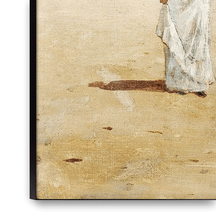 Plage d'East Hampton, Long Island (1874) par Winslow Homer. Original de la National Gallery of Art. Winslow Homer (Boston, 24 février 1836 - Prout's Neck, Maine, 29 septembre 1910) était un lithographe, dessinateur et peintre américain. Il est considéré par beaucoup comme le peintre américain le plus important du XIXe siècle[1] Homer est un représentant de la peinture de genre réaliste. Il était un excellent peintre animalier et a réalisé de nombreuses aquarelles. Il était célèbre pour ses paysages marins. Les croquis et les dessins qu'il a réalisés au front ont ensuite été élaborés à l'huile. Au départ, les illustrations étaient plutôt superficielles et anecdotiques, mais vers la fin de la guerre, elles ont gagné en profondeur et ont montré une compréhension du sens et des conséquences profondes de la bataille, comme en témoigne, par exemple, le tableau présenté ici, qui lui vaudra d'être admis à l'Académie.