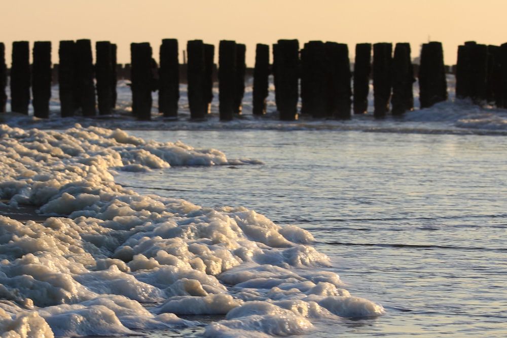 Des têtes de mousse sur la plage de Westkapele, un brise-lames à l'arrière-plan et le ciel qui virait au jaune lorsque le soleil se couchait lentement.