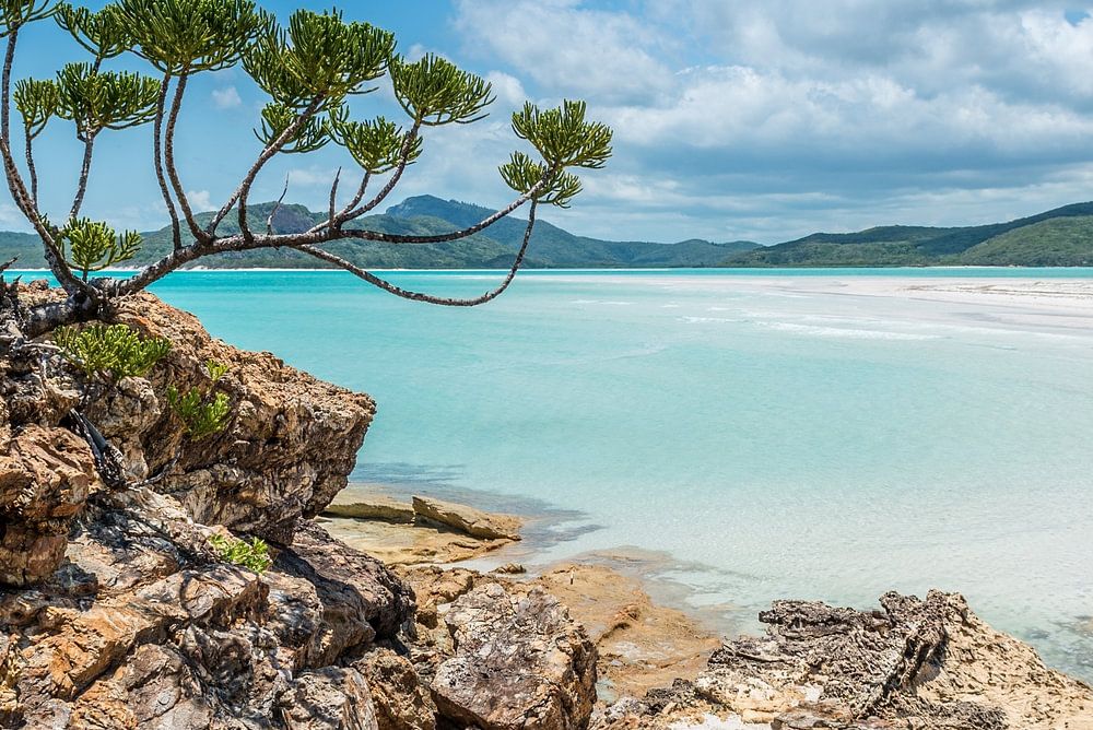 La magnifique baie bleue des Whitsundays située sur la plage de Whitehaven. Au premier plan, quelques buissons avec une vue sur la baie derrière eux. Quelques autres petites îles sont visibles au loin, complétant l'image.