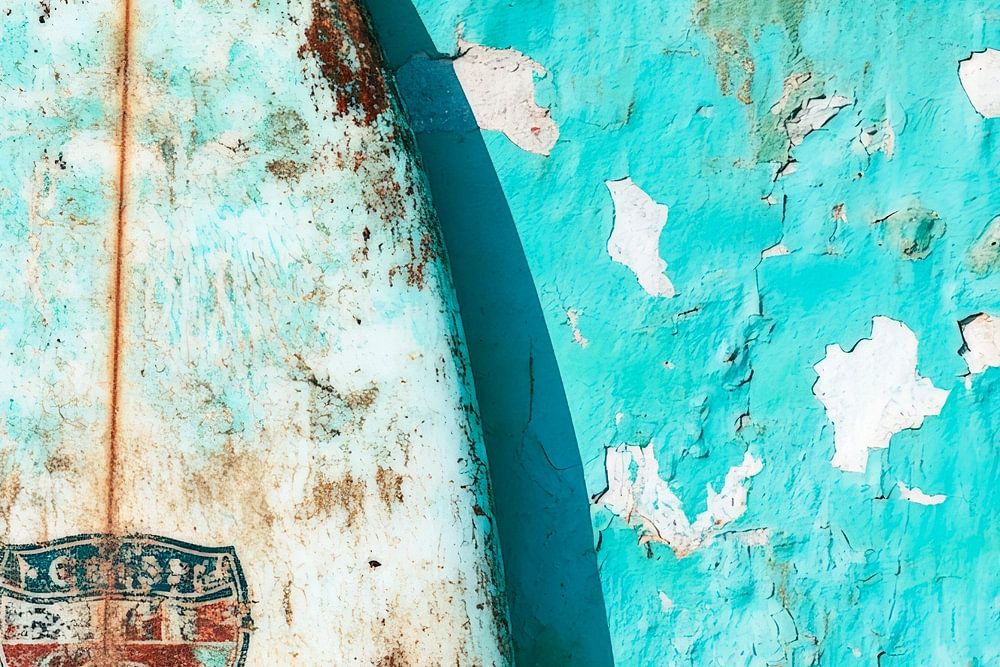 Avec son charme usé et son mur bleu aqua lumineux en arrière-plan, cette planche de surf raconte des histoires de vagues et de soleil. Les couleurs texturées et l'aspect rustique confèrent à chaque pièce une atmosphère détendue et décontractée. Parfait pour un salon ou un coin cuisine, pour créer une touche d'ambiance côtière et éveiller la nostalgie de l'ailleurs.