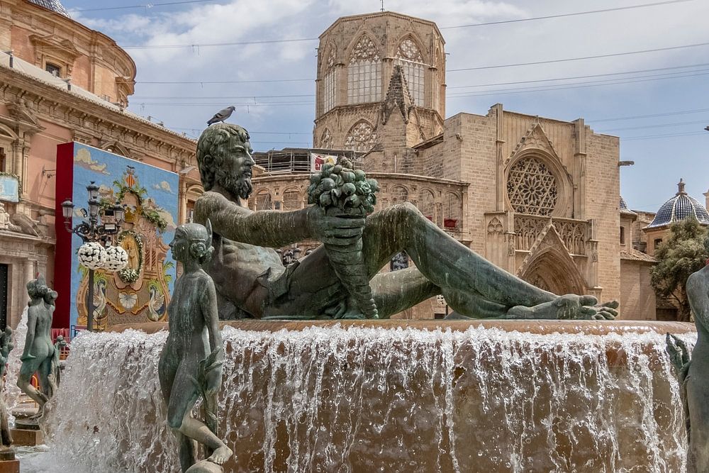 et belle vue de la place dédiée à la Vierge Marie, la Plaza de la Virgin est située dans la vieille ville de Valencia. J'ai pris cette photo lors d'une journée ensoleillée du mois de mai. Sur la photo, vous pouvez voir la fontaine 'Fuente del Agua de la Acequia', proéminente au premier plan. À gauche se trouve la Basílica de la Virgen de los Desamparados, avec sa façade rose tendre. Elle était richement décorée à l'époque, en raison de la fête " La Mare de Déu dels Desemparats ". Dans le coin arrière, vous pouvez voir la célèbre cathédrale de Valence, avec sa tour qui la surplombe. Dans l'ensemble, une image colorée et vivante de la place la plus célèbre de Valence.