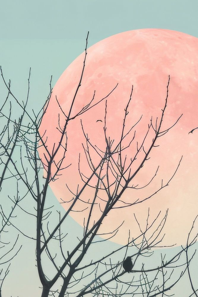 Cette représentation paisible d'une pleine lune au-dessus de la cime d'un arbre crée une atmosphère calme et méditative. Les tons délicats et les branches en filigrane combinés aux silhouettes des oiseaux confèrent au tableau une élégance harmonieuse. Idéal pour les chambres à coucher qui recherchent une décoration relaxante et proche de la nature.