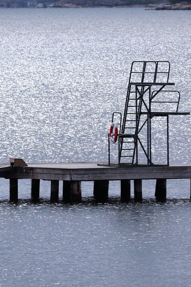 Un plongeoir dont la silhouette se détache sur une mer argentée étincelante à Trosa-Havsbad, près de Trosa dans le Södermanland, en Suède. Une lumière magnifique se reflète sur l'eau, avec un ciel sombre et des nuances de bleu, de gris et d'argent qui se complètent.