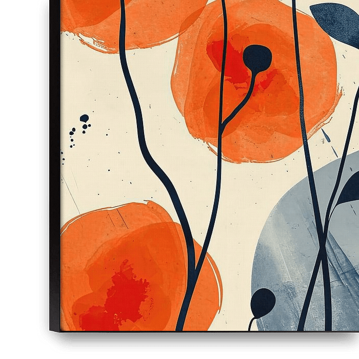 Des fleurs orange vibrantes se détachent sur un fond bleu froid et beige neutre, dégageant un sentiment de chaleur et de calme. Les fleurs sont stylisées et simplifiées à l'extrême, avec des lignes fluides représentant les tiges et les…
