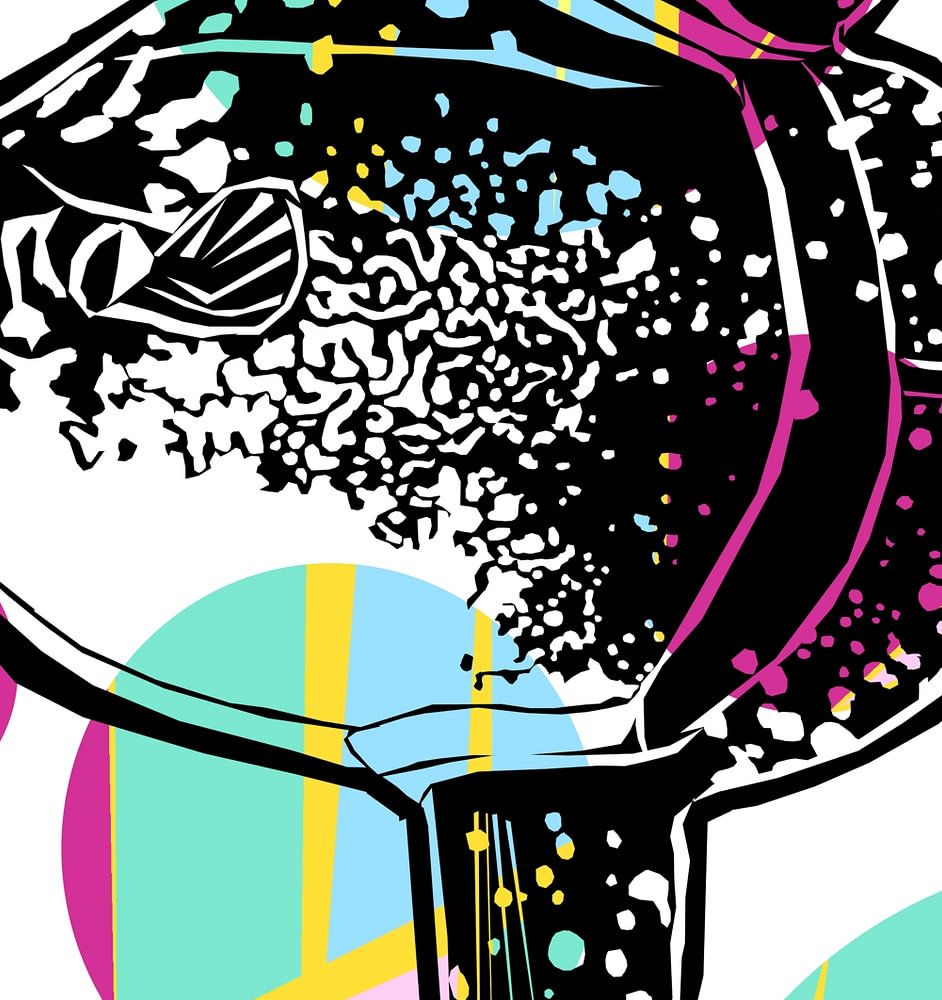 Kitty Bertelink a conçu et dessiné ce poisson-lune à l'encre noire. Le poisson nage dans une mer colorée. Rose, turquoise, bleu clair et jaune.