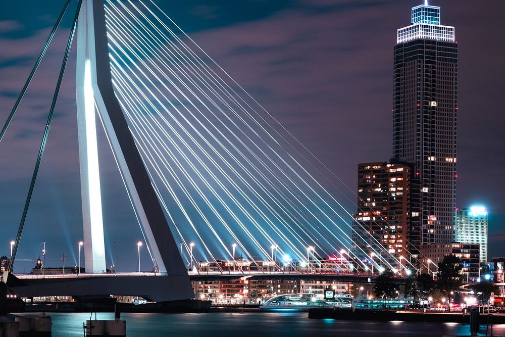 L'emblématique pont Erasmus de Rotterdam et le Zalmhavenentoren. La photo a été prise de nuit, de sorte que toutes les lumières sont bien visibles.