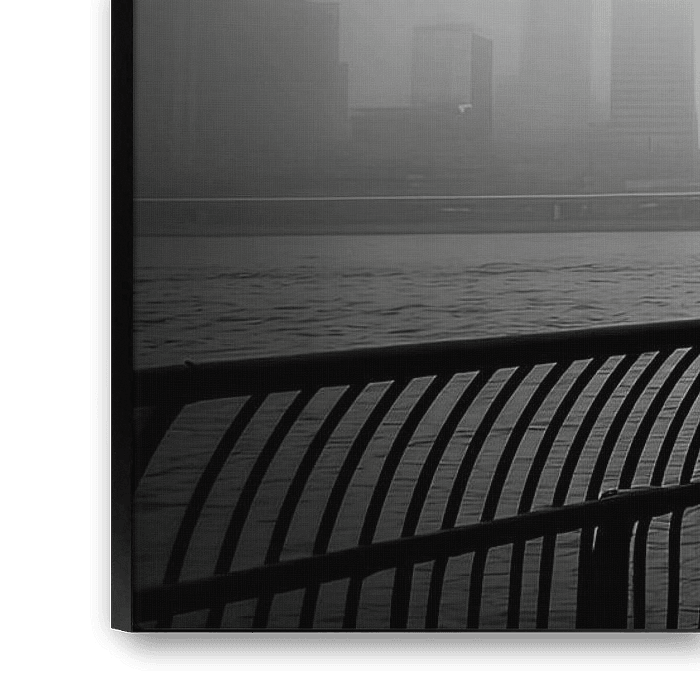 Un pont noyé dans la brume, un quai désert et une ligne d'horizon qui s'estompe lentement : cette photographie en noir et blanc du pont de Manhattan capture un moment de silence dans la ville qui ne dort jamais. La brume épaisse cache les bâtiments et étouffe les bruits de la vie quotidienne, créant une atmosphère presque magique. Le pont flotte pour ainsi dire au-dessus du fleuve et le jeu des lignes de la treille sur le quai guide le spectateur vers le lointain.