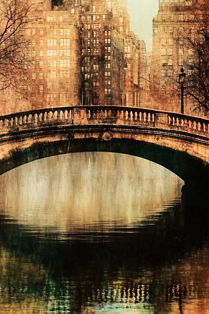 Cette peinture représente un pont historique dans un cadre urbain. Les couleurs chaudes et l'aspect usé par le temps lui confèrent une touche vintage qui évoque la nostalgie. Les reflets de l'eau renforcent l'atmosphère sereine, tandis que les bâtiments environnants créent un air d'élégance urbaine. Ce motif est parfait pour les amateurs d'art classique et de paysages urbains. Il est idéal pour ajouter une touche chaleureuse et élégante à n'importe quel intérieur.