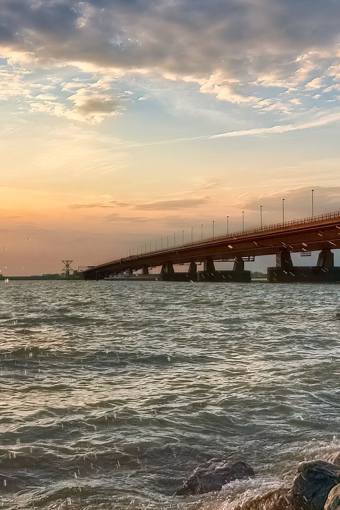 Le pont de Moerdijk sur le Hollands Diep assure la liaison entre le Brabant septentrional et la Hollande méridionale. Pendant l'heure d'or, cette photo a été prise depuis le Biesbosch à Dordrecht. La puissante formation nuageuse et les rochers recouverts d'algues au premier plan font de cette photo un véritable festin de couleurs. Cette vue spectaculaire ne vous lassera pas de sitôt.