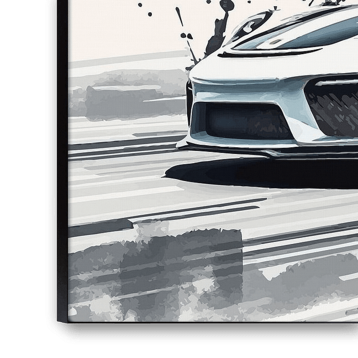Dans cette vision sumi-e à couper le souffle, la Porsche 911 GT3 RS n'est pas seulement peinte, elle est déchaînée. Chaque coup de pinceau sauvage porte le rythme de l'accélération, comme si l'encre elle-même courait sur le papier, guidée par l'instinct plutôt que par le contrôle. Les courbes emblématiques de la voiture émergent de la brume et de l'ombre, façonnées non pas par des lignes précises mais par des gestes expressifs qui donnent vie à la forme. L'encre noire se fond dans de doux dégradés de gris, comme des nuages de fumée traînant derrière un moment de mouvement. Les éclaboussures d'encre s'éparpillent sur la surface, chaotiques mais délibérées, incarnant à la fois la violence et la grâce de la vitesse. La peinture semble vivante, pleine d'énergie, comme si l'esprit de la GT3 RS rugissait tranquillement sous la surface du papier.
