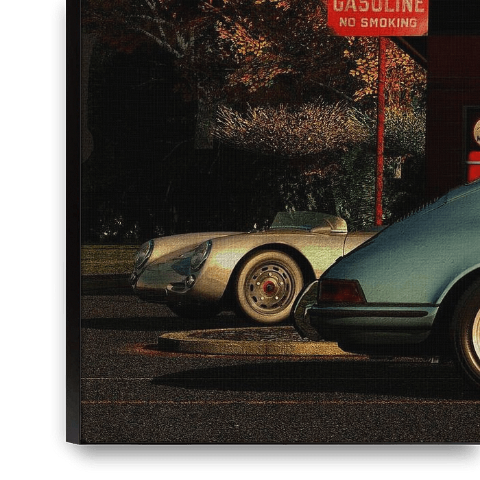 La Porsche la plus célèbre est bien sûr la Porsche 911. Dans cette œuvre, j'ai réuni la Porsche 911 avec deux de ses précurseurs de gang sur lesquels son design est basé. Vous voyez la Porsche 550 Spyder et la Porsche 356 derrière la Porsche 911 dans une vieille station-service.