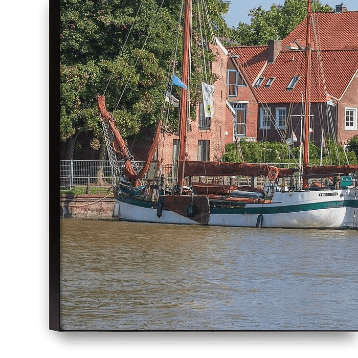 Hôtel de ville avec bateaux traditionnels et port de commerce, Leer, Frise orientale, Basse-Saxe, Allemagne, Europe