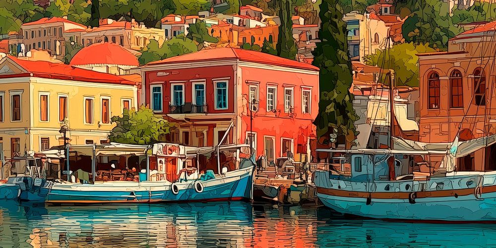 Cette vue imprenable sur Athènes capture l'harmonie parfaite entre la splendeur antique et la vie moderne trépidante le long du port historique. L'emblématique Parthénon et l'Acropole se dressent majestueusement sur le versant rocheux, baignés dans la chaude lumière dorée du soleil qui transforme le marbre antique en pierre couleur miel. En contrebas, le pittoresque quartier du port palpite de vie, tandis que les bateaux de pêche traditionnels, dans les tons bleus et blancs classiques de la Méditerranée, se balancent doucement dans les eaux turquoises cristallines. Les charmants bâtiments néoclassiques qui bordent le port se présentent dans une charmante palette de couleurs composée de rose corail, de jaune soleil et de rouge terre cuite, leurs façades se reflétant magnifiquement dans la surface lisse et miroitante de l'eau. Cette représentation artistique capture parfaitement la beauté intemporelle d'Athènes, où chaque recoin raconte une histoire qui remonte à des millénaires.