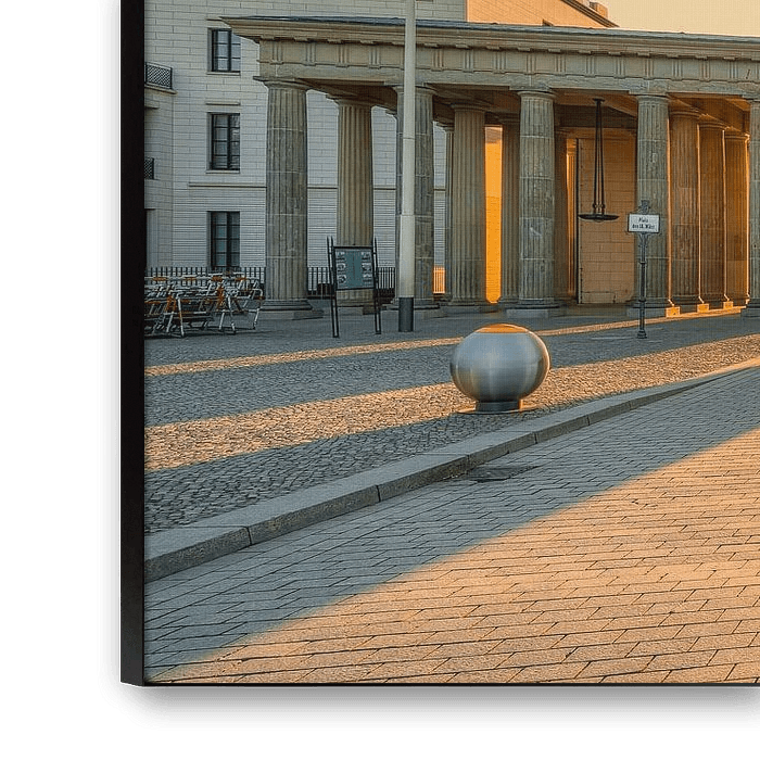 Lever de soleil à la porte de Brandebourg, chaleureusement éclairée par le soleil qui vient de se lever. Les colonnes réfractent la lumière solaire incidente plate et, avec les longues ombres, créent un très bel effet de lumière sur les pavés de la Platz des 18.
