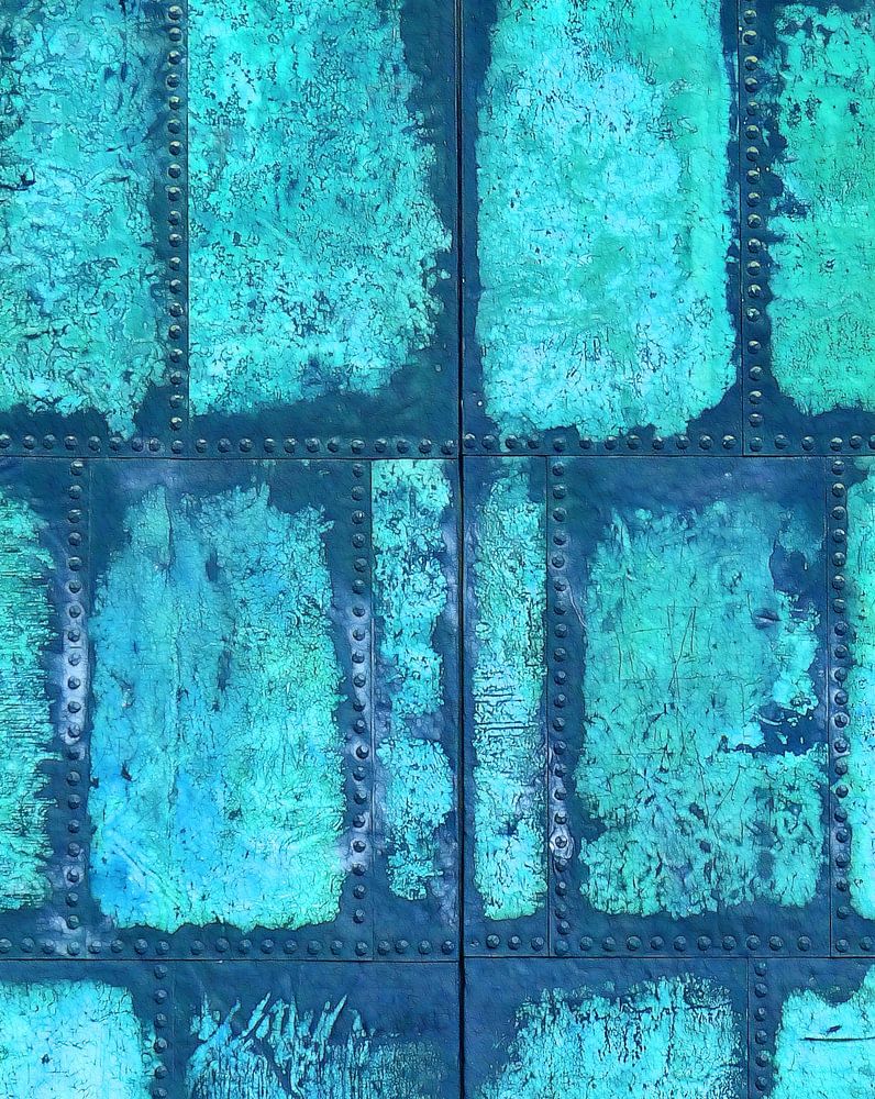 Lorsque le cuivre s'oxyde, on obtient une belle couleur cyan. (Essence). C'est une porte d'église. Vous pouvez voir les clous comme des petits bouts dans la porte. Il s'agit probablement d'une porte d'autrefois, mais depuis, elle n'a fait que s'embellir !