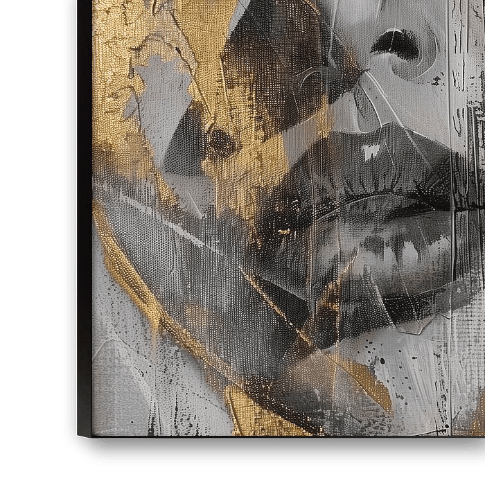 Cette peinture abstraite, conçue à l'aide de l'IA, représente le portrait intrigant d'une femme, en utilisant un mélange de nuances de gris et d'or pour simuler la profondeur et la texture. Les yeux et les lèvres de la femme sont partiellement cachés par des coups de pinceau grossiers, évoquant un sentiment de mystère et d'introspection.