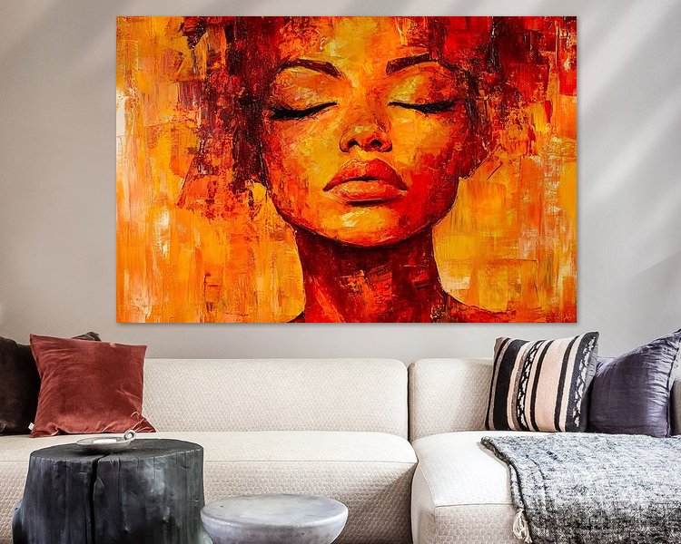 Ce tableau représente un portrait de femme puissant et expressif, exécuté dans des tons chauds de rouge, d'orange et de jaune. Le dessin dégage une énergie intense grâce à ses coups de pinceau épais et à son style abstrait, ce qui en fait un véritable accroche-regard dans n'importe quelle pièce. Les couleurs chaudes et la composition en font une œuvre d'art parfaite pour ceux qui recherchent un ajout dynamique et moderne à leur intérieur. Le tableau ajoute à la fois de la profondeur et de la chaleur à une pièce et est idéal pour les chambres à coucher, les salles à manger ou d'autres endroits où une atmosphère animée est souhaitée.