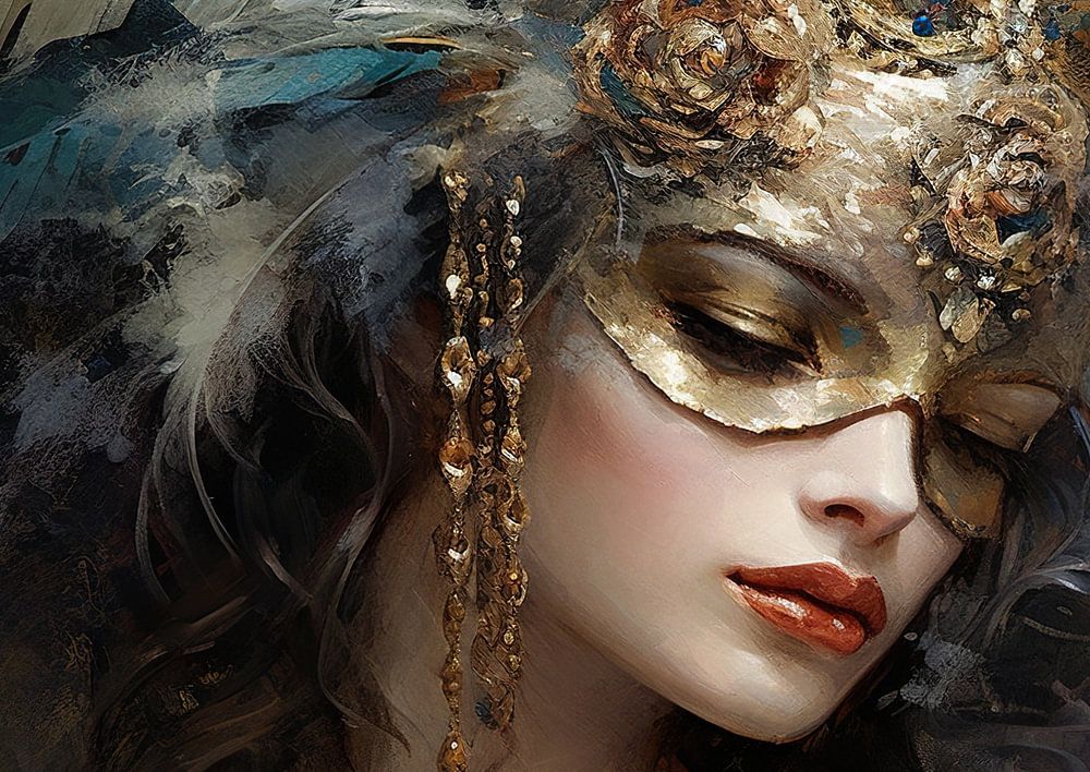 Portrait au masque d'or - Ce tableau représente une figure élégante portant un masque. Il se caractérise par une texture riche et une palette de tons principalement dorés et terreux, enrichis de touches de bleu tendre. Le style est réaliste avec une touche d'impressionnisme, les détails fins du masque et des plumes contrastant de manière captivante avec l'arrière-plan plus doux et en éventail. Les masques ajoutent une couche de mystère, magnifiquement rendue ici ; ils nous invitent à regarder au-delà de la surface pour découvrir les émotions et l'identité voilées.