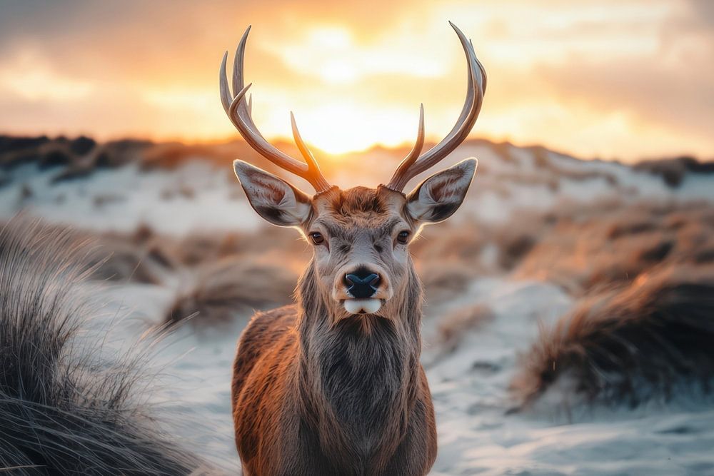 Le portrait représente un cerf dans les dunes des Pays-Bas, capturé juste après le lever du soleil. L'aube douce illumine les environs de teintes chaudes, tandis que le cerf se tient tranquillement dans le silence. Les rayons dorés jouent sur sa fourrure, soulignant ses formes gracieuses. Les dunes l'entourent d'une splendeur calme et naturelle, et l'herbe sur laquelle il se tient est encore scintillante de rosée. L'image capture la beauté du moment entre la nuit et le jour, un début de journée paisible dans le paysage néerlandais. Le cerf semble ne faire qu'un avec la nature, dans une scène matinale harmonieuse.
