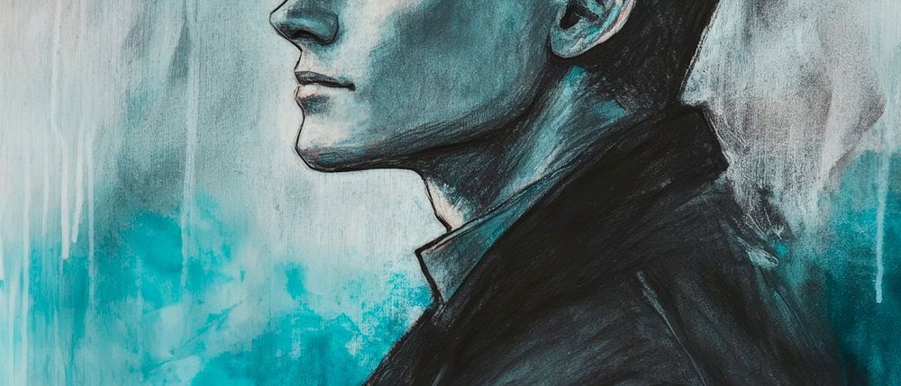 Un jeune homme impressionnant aux traits profonds et pensifs occupe le centre de l'image, entouré d'une fascinante composition de couleurs dans les tons gris et bleus. Son regard intense et le flou artistique confèrent à l'image globale une profondeur mélancolique, idéale dans un salon ou un bureau créatif pour favoriser l'inspiration et la réflexion.